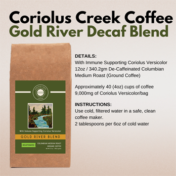 • Coriolus Creek Coffee Gold River Blend Decaffeinated with Immune Supporting Coriolus Versicolor
