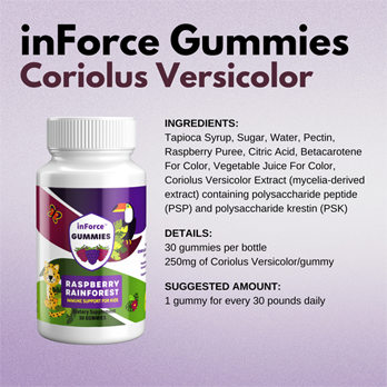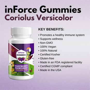 Discover the power of nature with our latest innovation - inForce Gummies, infused with the immune-supporting Coriolus Versicolor mushroom. Perfect for the whole family, these gummies are safe for kids and are the healthiest choice on the market, free from corn syrup, artificial dyes, and any GMOs. We're proud to offer a product that is not only vegan and kosher but also made in the USA adhering to the highest standards of quality.